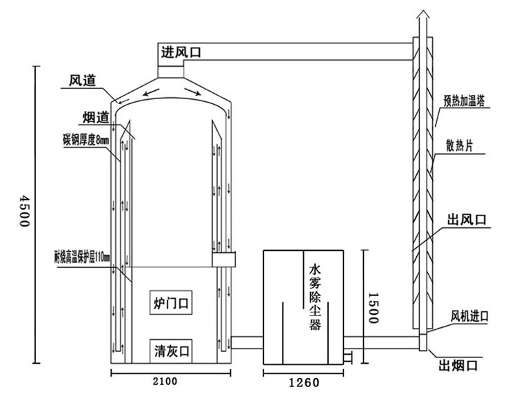 煙風各行其道,煙道循環(huán)兩次,熱風循環(huán)三次,通過往復式環(huán)繞循環(huán)充分吸收爐體的輻射溫度大大加強了爐體的使用壽命,爐體燃燒層通過使用客戶反饋的意見,我公司在HD-Ⅰ的基礎加以改進HD-Ⅱ型內膽用鍋爐鋼Q345C大大加強鍋爐的抗氧化性,燃燒室采用耐高溫1700°的高鋁耐火磚經(jīng)過特殊處理進一步加強了對Q345C的良好保護性,使我們的高溫熱風爐更###耐用,外保溫采用保溫材料硅酸鋁100mm,鍍鋅彩鋼板做裝飾。